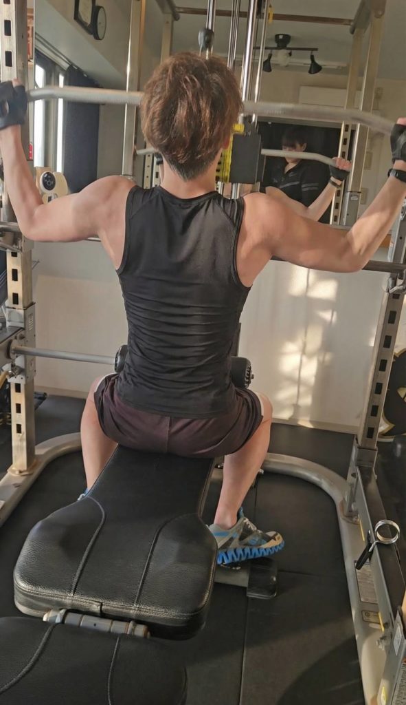 トレーニングでは一つひとつの動作の質を高め、狙った部位にしっかり効かせることを大切にしながら、見た目に直結する身体作りを進めていきました。